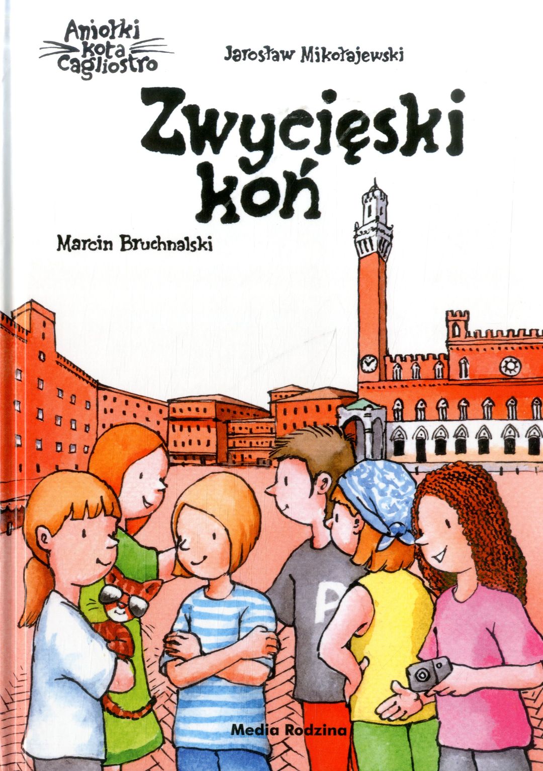 Trzecia książka o kocie Cagliostro i jego aniołkach - sześciu dziewczynkach z różnych krajów. Rudy kot tym razem sobie tylko znanym sposobem wzywa dziewczynki do Sieny w Toskanii, gdzie jak co roku ma się odbyć palio - gonitwa konna. Tyle że pretendent do zwycięstwa... znika! I to jest właśnie zadanie dla dociekliwych pomocnic kota Cagliostro. Podczas rozwiązywania tej niemal kryminalnej zagadki poznajemy także Sienę i jej malownicze okolice.