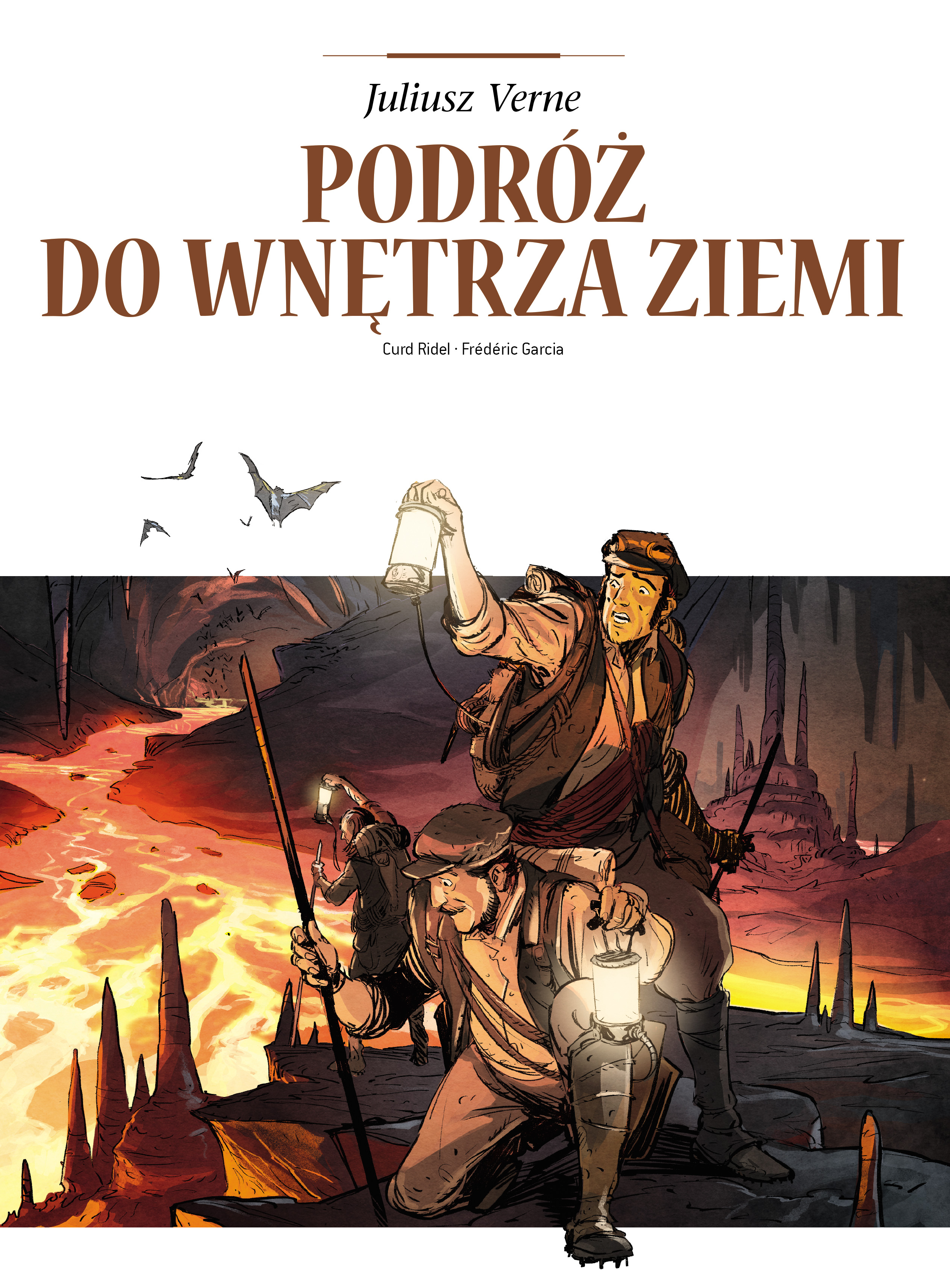 Komiksowa adaptacja jednej z najlepszych i najbardziej znanych powieści science fiction autorstwa Juliusza Verneʼa. Napisana w 1864 roku „Podróż do wnętrza Ziemi” była jedną z pierwszych powieści poruszających tematykę eksploracji wnętrza Ziemi. Historia rozpoczyna się, gdy mieszkający w Hamburgu profesor mineralogii Otto Lidenbrock i jego siostrzeniec Aksel rozszyfrowują starożytny manuskrypt runiczny, w którym islandzki historyk opisał swoją rzekomą wyprawę do wnętrza Ziemi. Postanawiają udać się na Islandię i przy pomocy Hansa, lokalnego przewodnika, odnajdują na dnie wulkanu przejście, które zaprowadzi ich do trzewi ziemskiego globu. Tam odkrywają niezwykły świat ogromnych jaskiń zamieszkałych przez dziwne stworzenia. A przygoda dopiero się zaczyna... Autorami albumu są pochodzący z Konga scenarzysta i kompozytor, autor wielu humorystycznych opowieści rysunkowych Curd Ridel („Ushuaia”, „Le Gowap”) oraz francuski rysownik Frédéric Garcia („Lucky Luke”) [opis wydawcy].