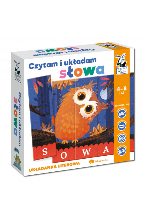 Układanka literowa "Czytam i układam słowa" to 17 pełnych humoru układanek, które stanowią idealną pomoc do nauki czytania dla przedszkolaków i dzieci w wieku wczesnoszkolnym. W zabawie z układankami dzieci rozwijają umiejętność tworzenia wyrazów z liter i odczytywania ich poprzez dopasowywanie kafelków z obrazkiem. W ten sposób szybciej zapamiętują poszczególne litery, a następnie przechodzą do komponowania z nich wyrazów i łączą je z właściwym znaczeniem, rozwijając w ten sposób motywację do nauki czytania. Złóż litery w wyrazy i odkrywaj obrazy! Czytam i układam słowa zachwycają ilustracjami i gwarantują dobrą zabawę. To pomoc dydaktyczna stanowiąca podstawę edukacji lub jej uzupełnienie. Oprócz nauki czytania dziecko ćwiczy spostrzegawczość, precyzję ruchów dłoni i umiejętność logicznego myślenia. Godna polecenia układanka! Marzena Fenert - terapeutka ręki, autorka pomocy logopedyczno-edukacyjnych dla dzieci, prowadzi blog KreatywneWrota.pl Układanka "Czytam i układam słowa" polega na układaniu prostych wyrazów: nazw zwierząt, pojazdów, maszyn i przedmiotów z najbliższego otoczenia. W skład pakietu wchodzi 60 dwustronnych kafelków, z których można ułożyć 8 trzyliterowych i 9 czteroliterowych nazw. Na odwrocie znajdują się pojedyncze litery, z których można układać własne słowa. Barwne ilustracje Katarzyny Nowowiejskiej przenoszą dziecko w świat, w którym można podpatrzeć siedzącą na gałęzi sówkę i drzemiącego smoka. Elementy układanki zostały wykonane z grubej tektury, co gwarantuje bezpieczną zabawę oraz wytrzymałość nawet podczas najbardziej emocjonujących rozgrywek.